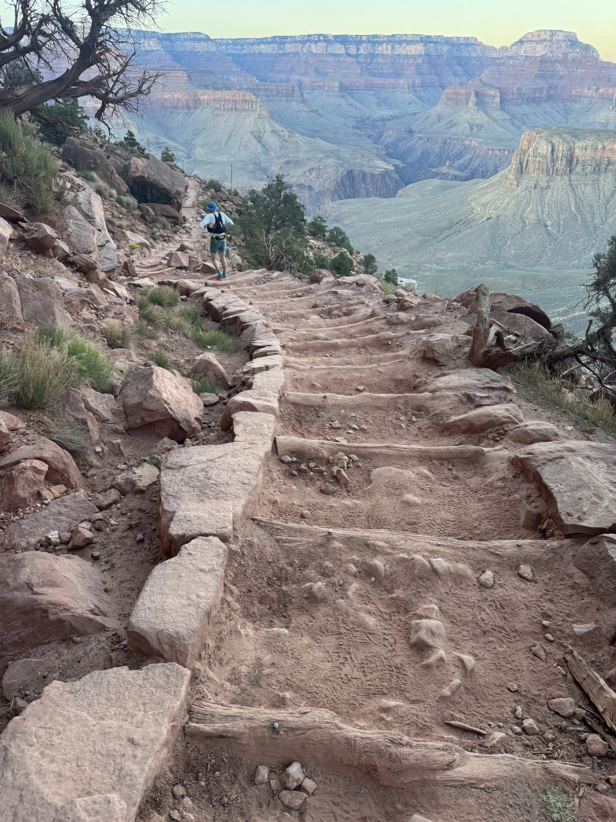 We caught a ride to the South Kaibab Trailhead. After saying our goodbyes to David, Lisa, and Andrew, Markus and I began our descent. Andrew got emotional—"You guys better get going or I’m going to start crying." I felt emotional too. The trail began with steep switchbacks and stunning views at every step. The steps were awkward for running, making it tough to find rhythm. The canyon’s layered contours and the distant Colorado River below were awe-inspiring. I quickly overheated in my Smartwool merino vest.