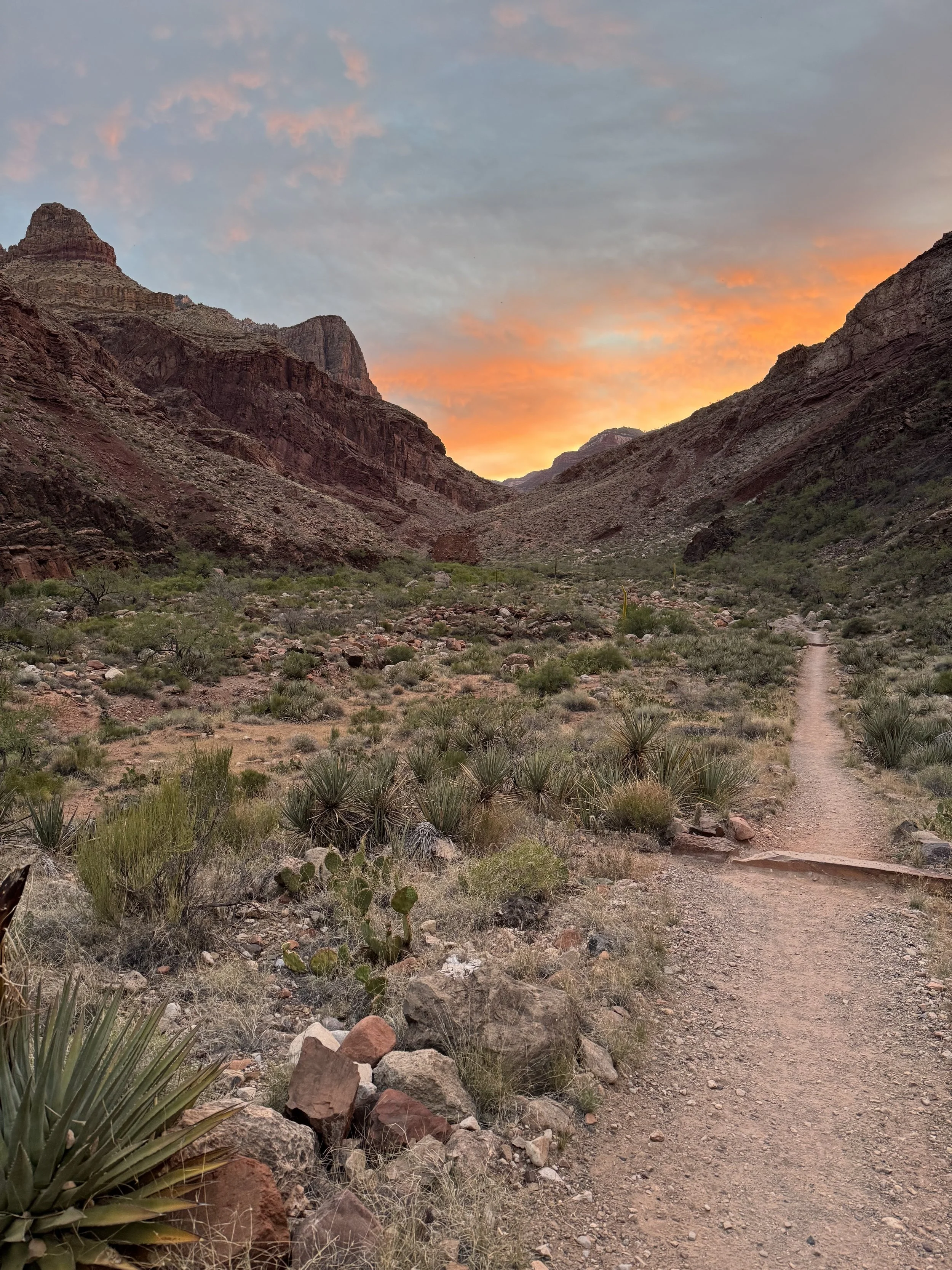 We reached Manzanita for a quick water refill and continued to Phantom Ranch. The sunrise in the Box was breathtaking—like a living painting. Shades of pink, orange, and gold colored the sky. Birds sang, and deer rustled through the bushes. It was a moment of quiet reflection, a reminder of nature’s power and beauty.