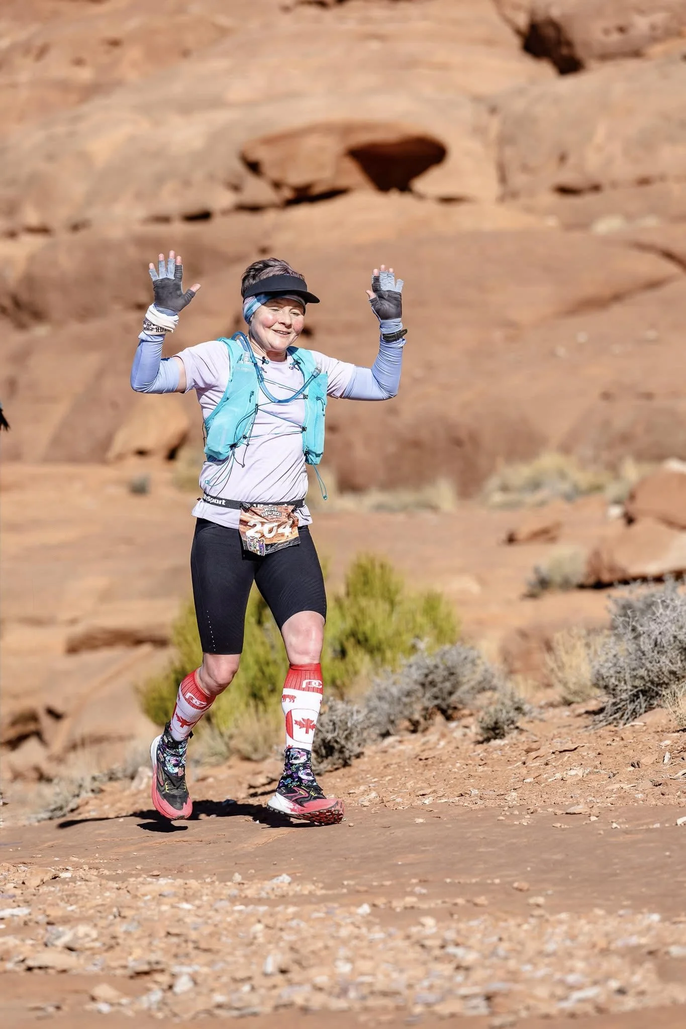 My mantra has always been, “Looking good, feeling strong, nothing can go wrong.” It rhymes, and I repeated that over and over in my head, especially when the going got rough; it really helps to regain focus. I had to remind myself of where I was and how grateful I felt to be in Moab, doing this crazy adventure with the Bad Ass Chicks and other Victoria folks and like-minded runners. I conversed a little with fellow Canadian racers Stuart and Daniel from Vancouver, and a group of prairie people from my hometown, Saskatoon and Estevan, were competing as well. Of course, there were many American participants, and thankfully, I didn’t notice any drama given the political status of the USA. We were all there to enjoy each stage of the race, take in the scenery, and get to the finish line.