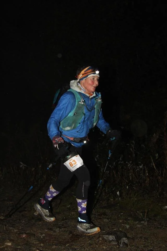 In the dark, I was all alone, so I turned up my music as a bear deterrent—after all, they are out there. Moments later, a headlight emerged, approaching me. It was the European. I asked him where he was going and if I was off course. He had forgotten his trail running pack at the last aid station and was now running back to retrieve it—poor guy.
